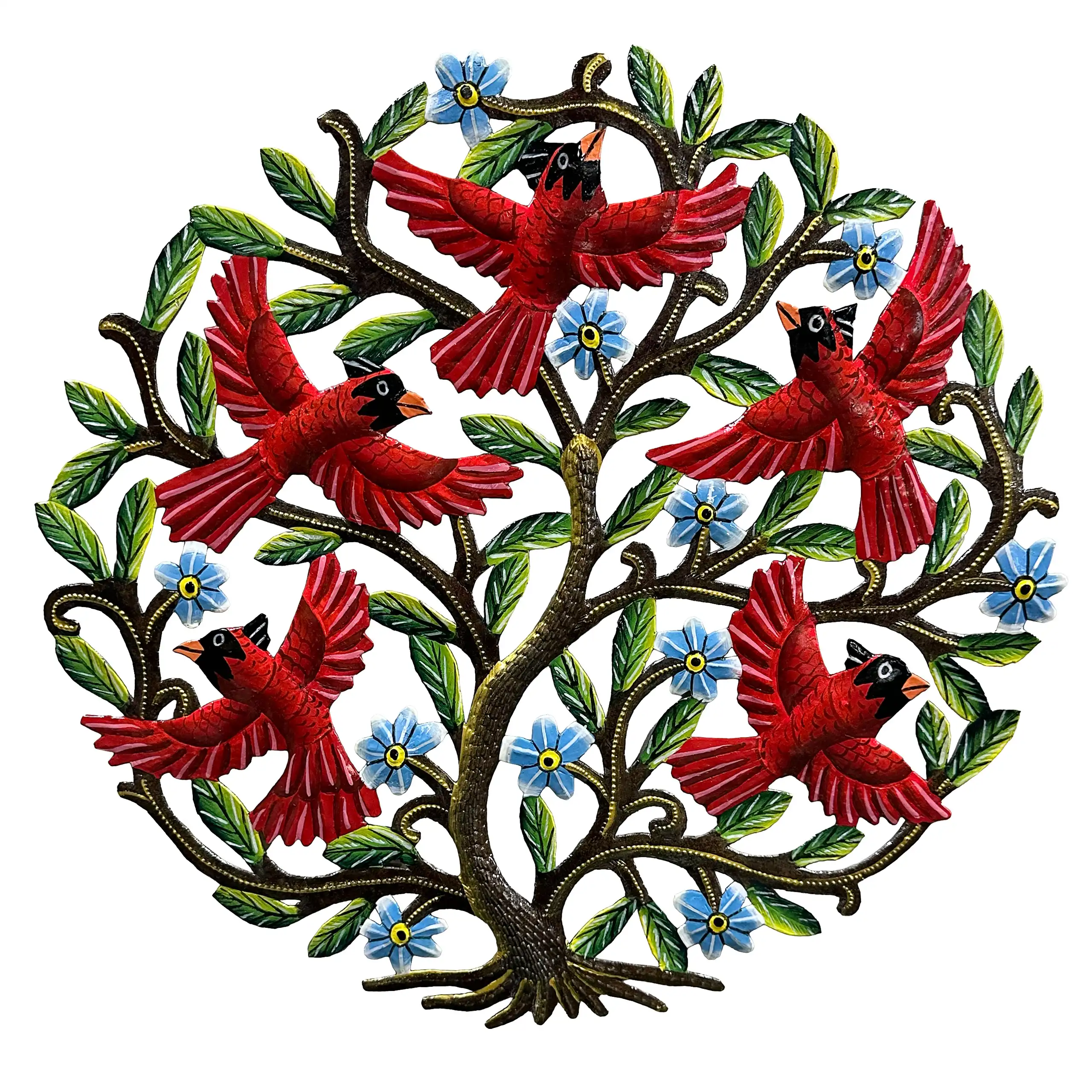 Perfect for home or garden, each Small Painted Cardinals Taking Flight is approximately 17″ x 17″ x 0.5″ and hand-chiseled out of recycled steel oil drums by Haitian artisans using techniques first developed by Georges Liautaud in the late 1950s when he chalked out his first design on a flattened steel oil drum and then cut it out by hand with a mallet and chisel. As each piece is handmade, their final dimensions and finish may vary slightly.