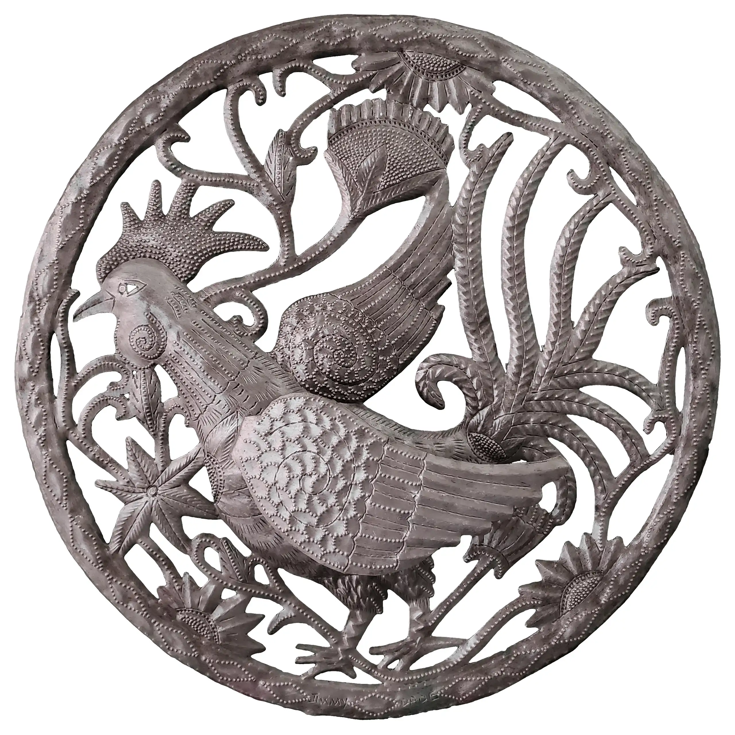 The 13.5" x 20.5" Peacock Contour is hand-chiseled out of recycled steel oil drums by Haitian artisans.