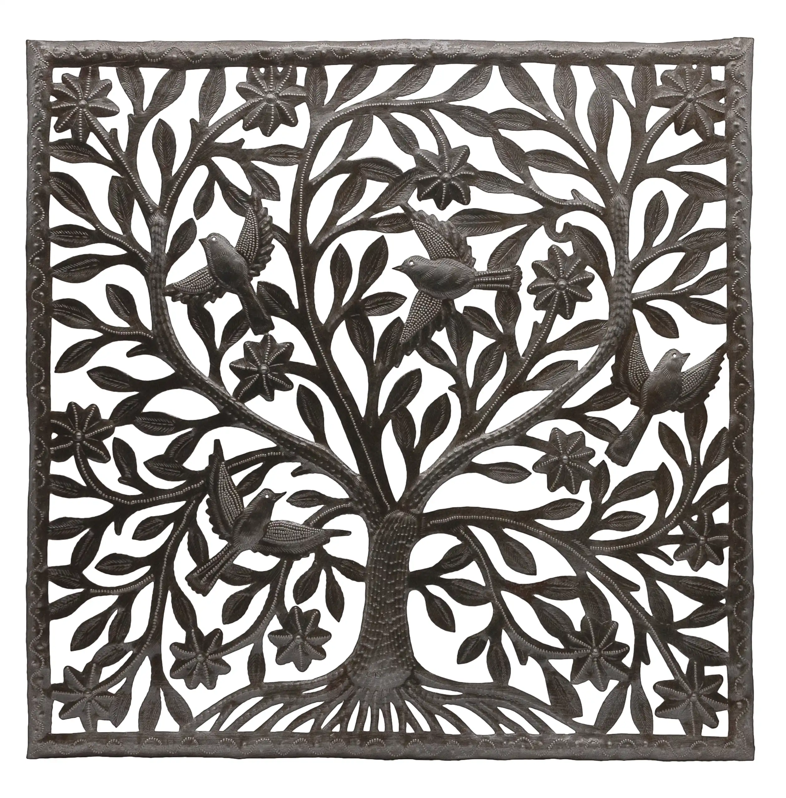 Perfect for home or garden, each Tree of Life Square with Border is approximately 24.25″ x 24.25″ x 1″ and hand-chiseled out of recycled steel oil drums by Haitian artisans using techniques first developed by Georges Liautaud in the late 1950s when he chalked out his first design on a flattened steel oil drum and then cut it out by hand with a mallet and chisel. As each piece is handmade, their final dimensions and finish may vary slightly.
