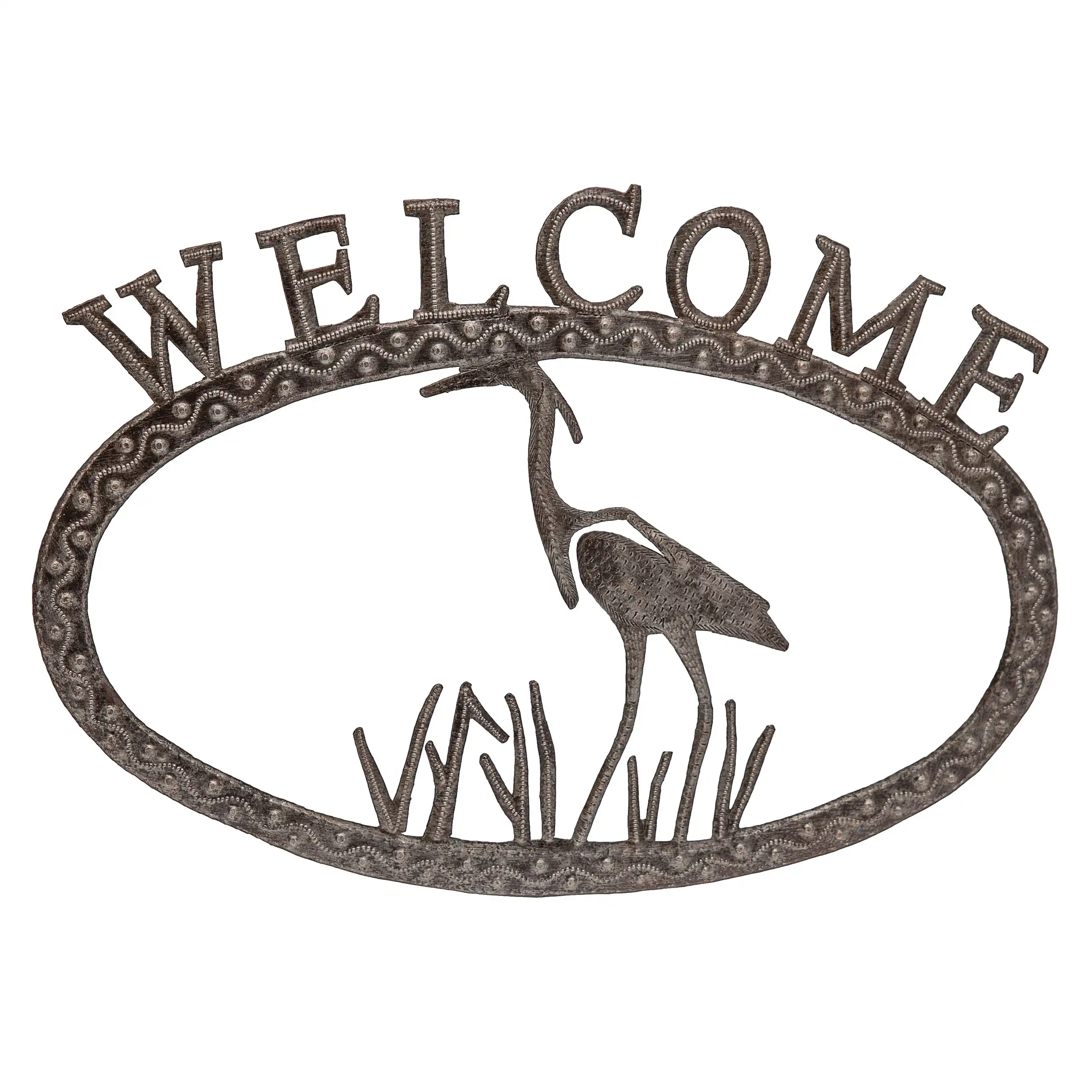 Perfect for home or garden, each Welcome Great Egret is approximately 16″ x 11.25″ x 0.5″ and hand-chiseled out of recycled steel oil drums by Haitian artisans using techniques first developed by Georges Liautaud in the late 1950s when he chalked out his first design on a flattened steel oil drum and then cut it out by hand with a mallet and chisel. As each piece is handmade, their final dimensions and finish may vary slightly.
