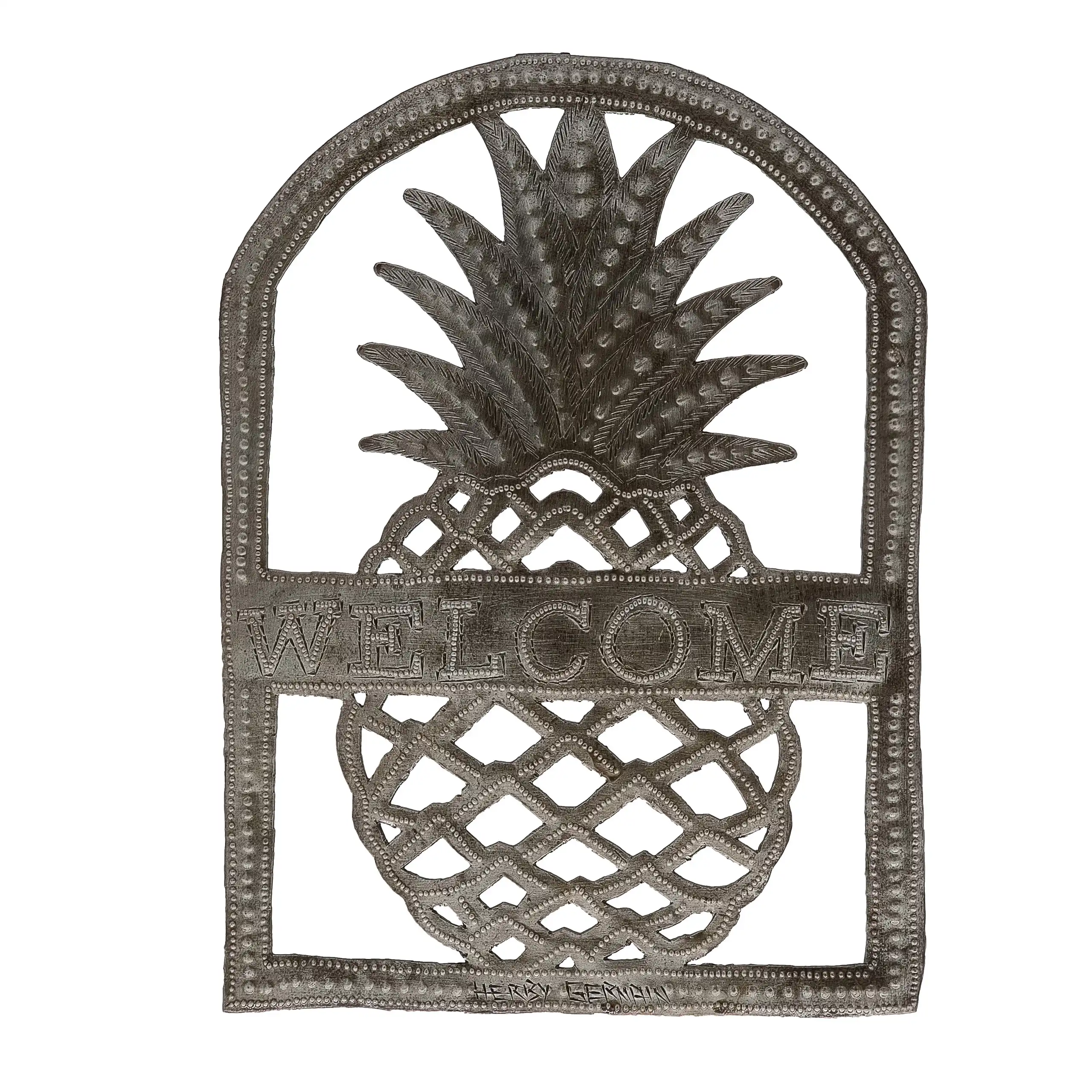 Perfect for home or garden, each Welcome Pineapple Arch is approximately 9.5″ x 12.75″ x 0.5″ and hand-chiseled out of recycled steel oil drums by Haitian artisans using techniques first developed by Georges Liautaud in the late 1950s when he chalked out his first design on a flattened steel oil drum and then cut it out by hand with a mallet and chisel. As each piece is handmade, their final dimensions and finish may vary slightly.