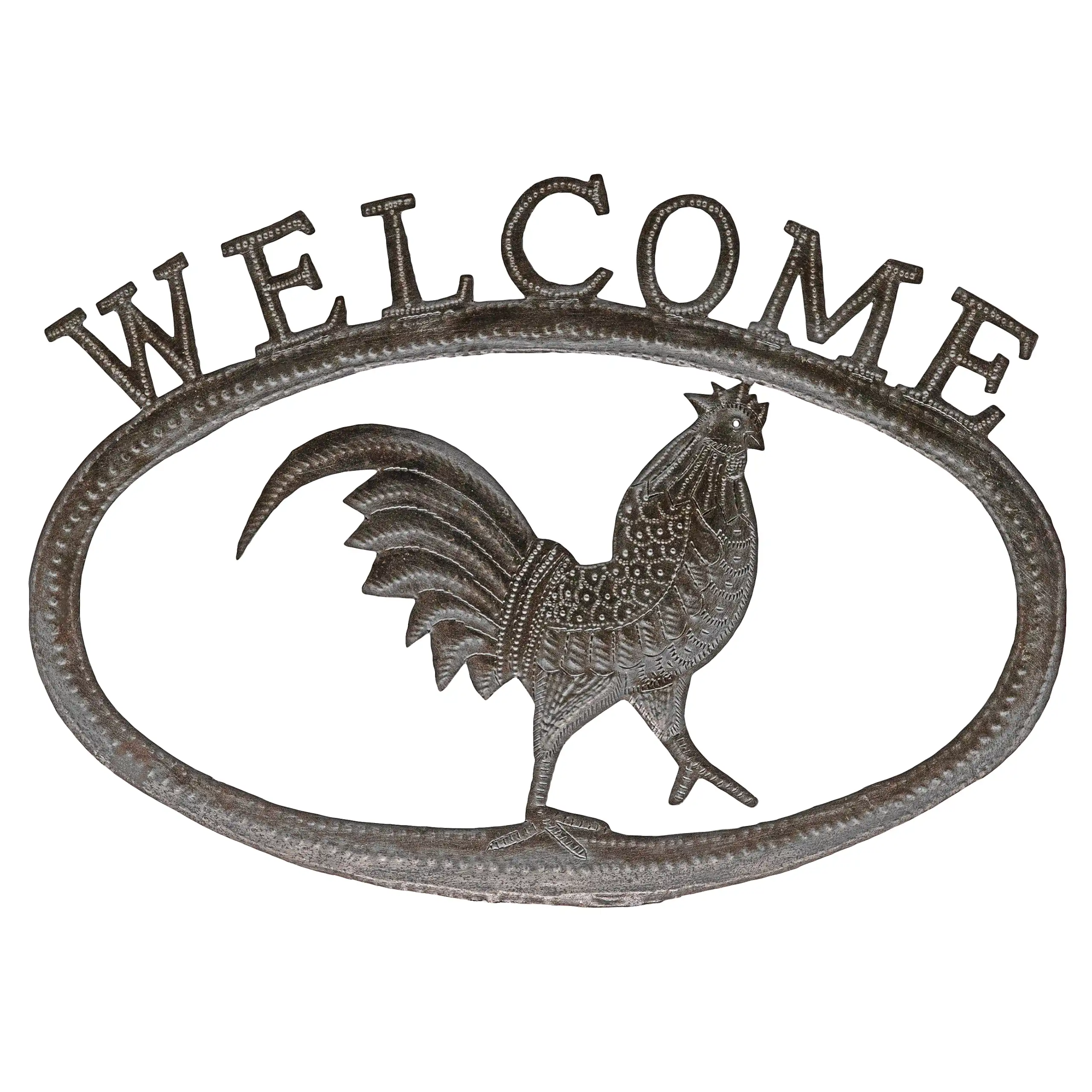 Perfect for home or garden, each Welcome Rooster is approximately 16.25″ x 11.5″ x 0.5″ and hand-chiseled out of recycled steel oil drums by Haitian artisans using techniques first developed by Georges Liautaud in the late 1950s when he chalked out his first design on a flattened steel oil drum and then cut it out by hand with a mallet and chisel. As each piece is handmade, their final dimensions and finish may vary slightly.